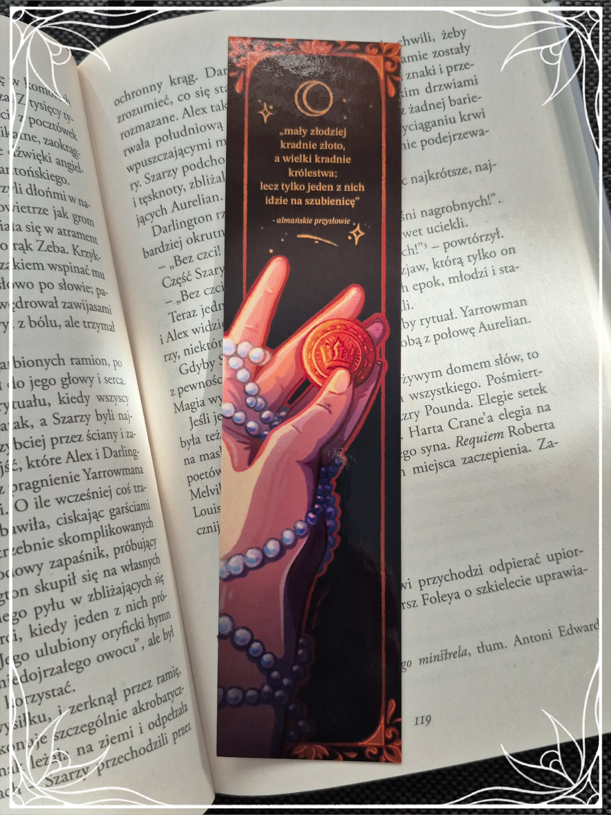 W świetle księżyca i gwiazd zapisano stare przysłowie, które wybrzmiewa niczym echo dawnej mądrości. Dłoń, a w niej spoczywający fening, perły otaczające jej palce niczym splątane nici przeznaczenia. Pytanie o granice między złodziejem a władcą.